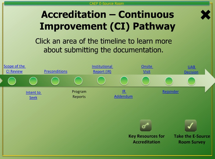 Welcome to the CAEP Electronic Resource Room - the E-Source Room. This website contains all of the necessary accreditation information that will help you complete and submit accreditation documents and reports. You will find templates, policies, sample reports, instructional guides, and updates about becoming CAEP.